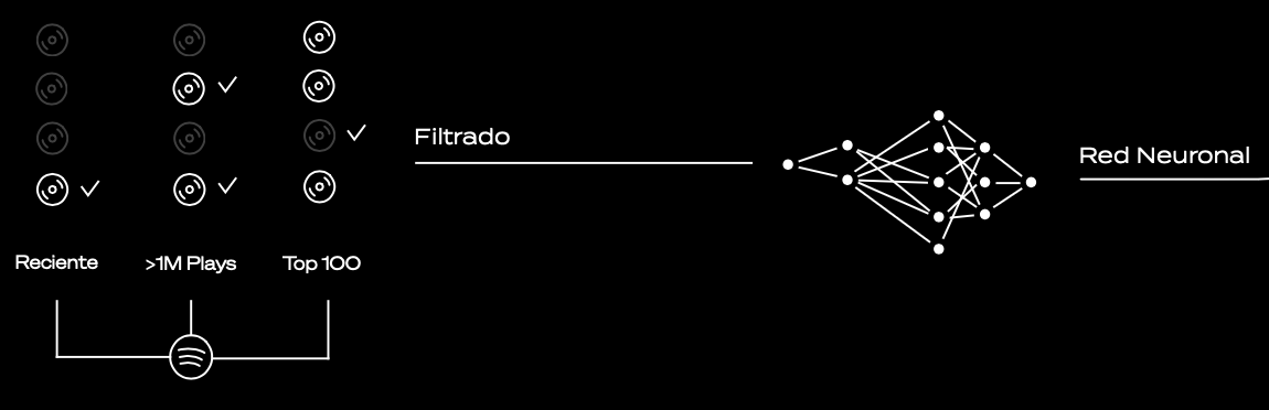 Para entrenar el modelo consolidamos un catálogo curado de canciones etiquetadas por género y subgénero y lo enriquecemos con metadatos públicos de popularidad por región. No almacenamos ni procesamos identificadores personales. Las variables de entrada se codifican de forma explícita: día de la semana en one-hot (un vector con un “1” en el día correspondiente), hora en bines (madrugada, mañana, tarde, noche), condición climática en one-hot (despejado, nublado, lluvia, tormenta, nieve), temperatura en bines (frío, templado, cálido) y, opcionalmente, estación del año. La salida es multi-hot sobre el espacio de géneros (pueden activarse varios a la vez). Dividimos en entrenamiento/validación/prueba con estratificación por género para evitar sesgos.