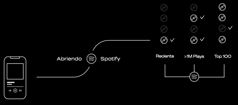 Para cada género candidato interrogamos la Spotify Web API con consultas específicas y restricciones regionales. Aplicamos filtros de calidad: popularidad mínima, presencia en listas locales y recencia para evitar temas obsoletos. El ranking final se calcula con score = α·p_modelo + β·popularidad + γ·recencia + δ·diversidad, donde diversidad penaliza repeticiones recientes mediante un TTL por (ciudad, hora_bin). Usamos muestreo con temperatura T para introducir variación controlada y evitar determinismo total. Los parámetros (α, β, γ, δ, T) se ajustan con experimentación A/B sobre eventos anónimos hasta lograr un buen equilibrio entre acierto y frescura.